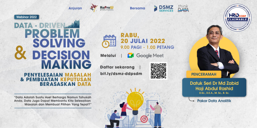 Webinar Data Driven: Problem Solving & Decision Making adalah satu program terbaru yang dibawakan khas oleh DSMZ Service Sdn Bhd. Ia sesuai untuk anda hadiri dan pelajari bagaimana cara untuk mengatasi masalah dan membuat keputusan untuk syarikat atau koperasi dengan menggunakan data-data atau maklumat yang anda miliki mahupun syarikat yang tidak mempunyai atau menyimpan data. Beberapa teknik akan diperkenalkan untuk mencari solusi bagi mengukuhkan kembali prestasi syarikat masing-masing demi menembusi pasaran baharu yang lebih luas dan besar, mengalahkan pesaing, selain membina rangkaian pelanggan terkini yang menggemari produk atau brand anda.